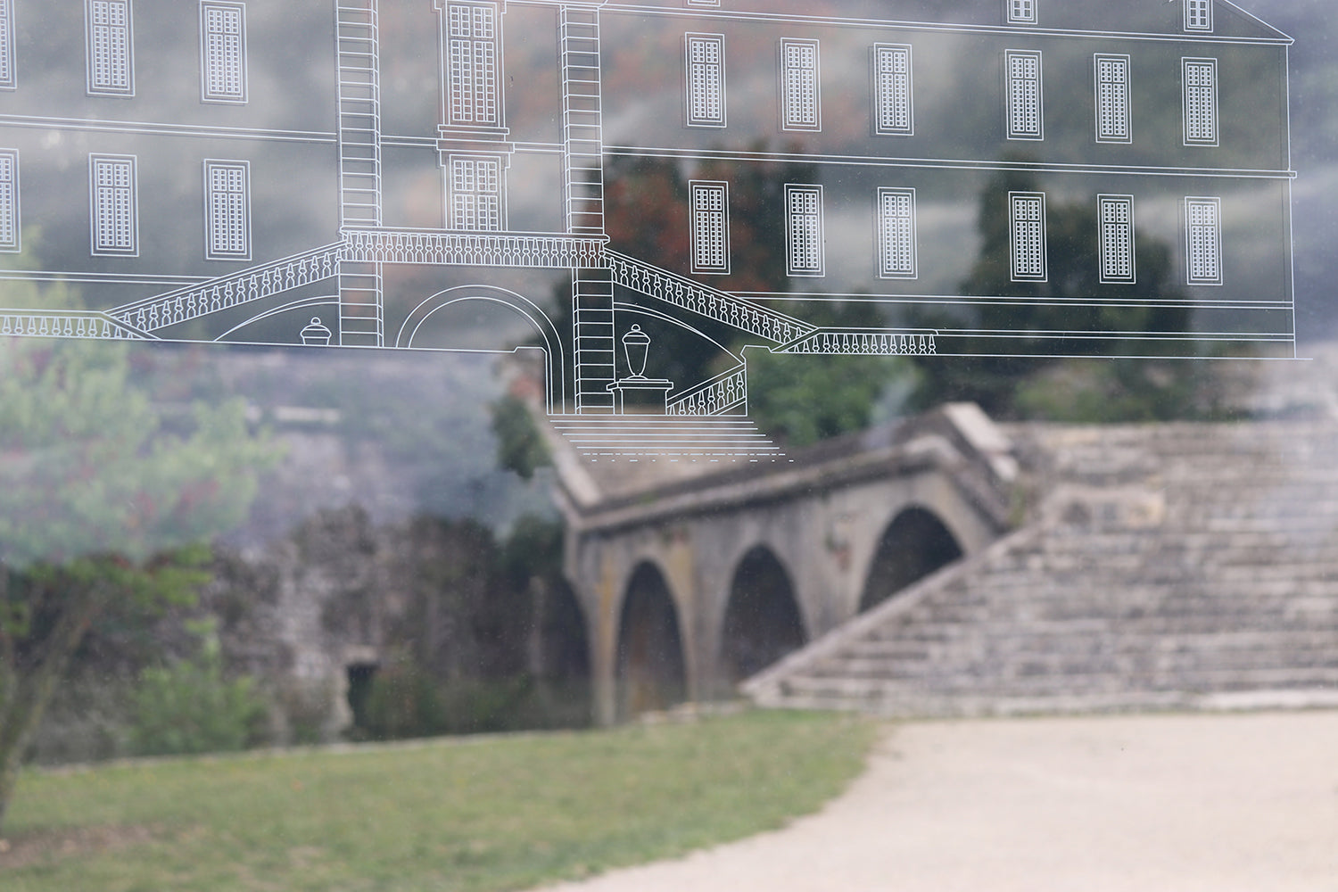 Le choix de l’implantation des supports et le cadrage proposé attire les visiteurs cheminant depuis les allées du parc public. En s’approchant du cadre, on découvre la présence d’un dessin du château en transparence, qui correspond au point de vue réel, mais ce qui y est représenté montre certes la partie existante du château mais on y perçoit surtout une partie disparue. En cherchant du regard à re-positionner ce qui reste du château, l’observateur découvre alors la position de l’aile manquante : le grand corps du logis.