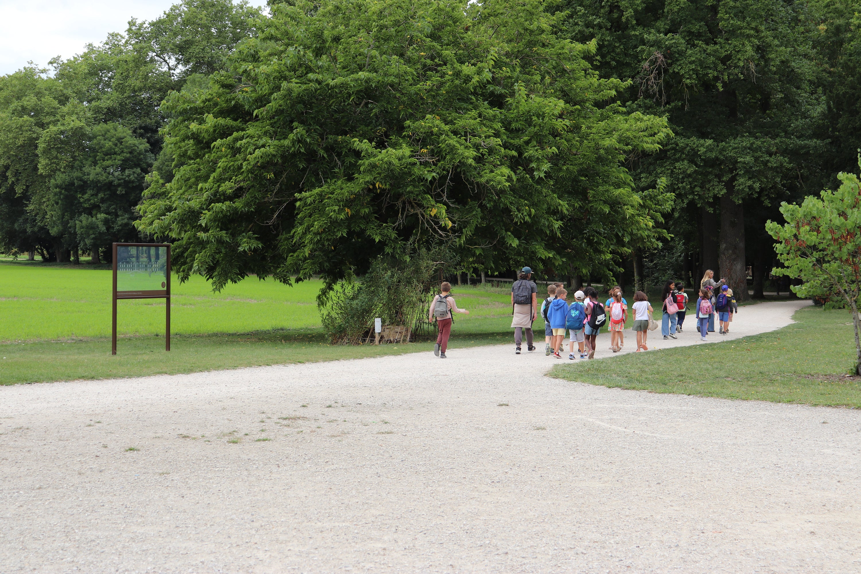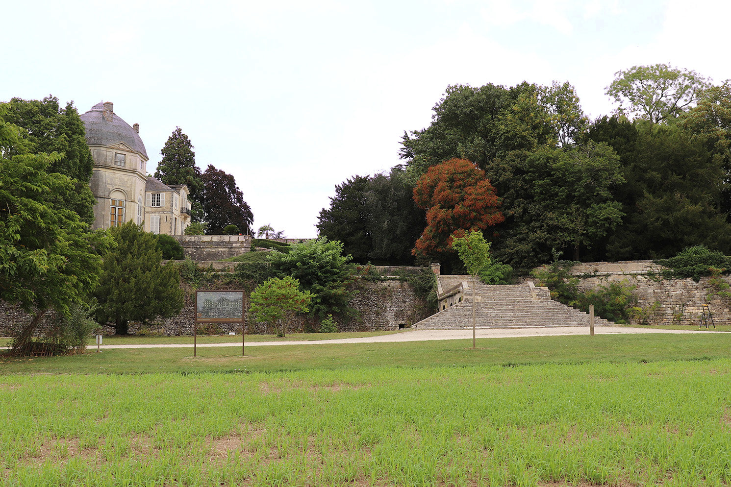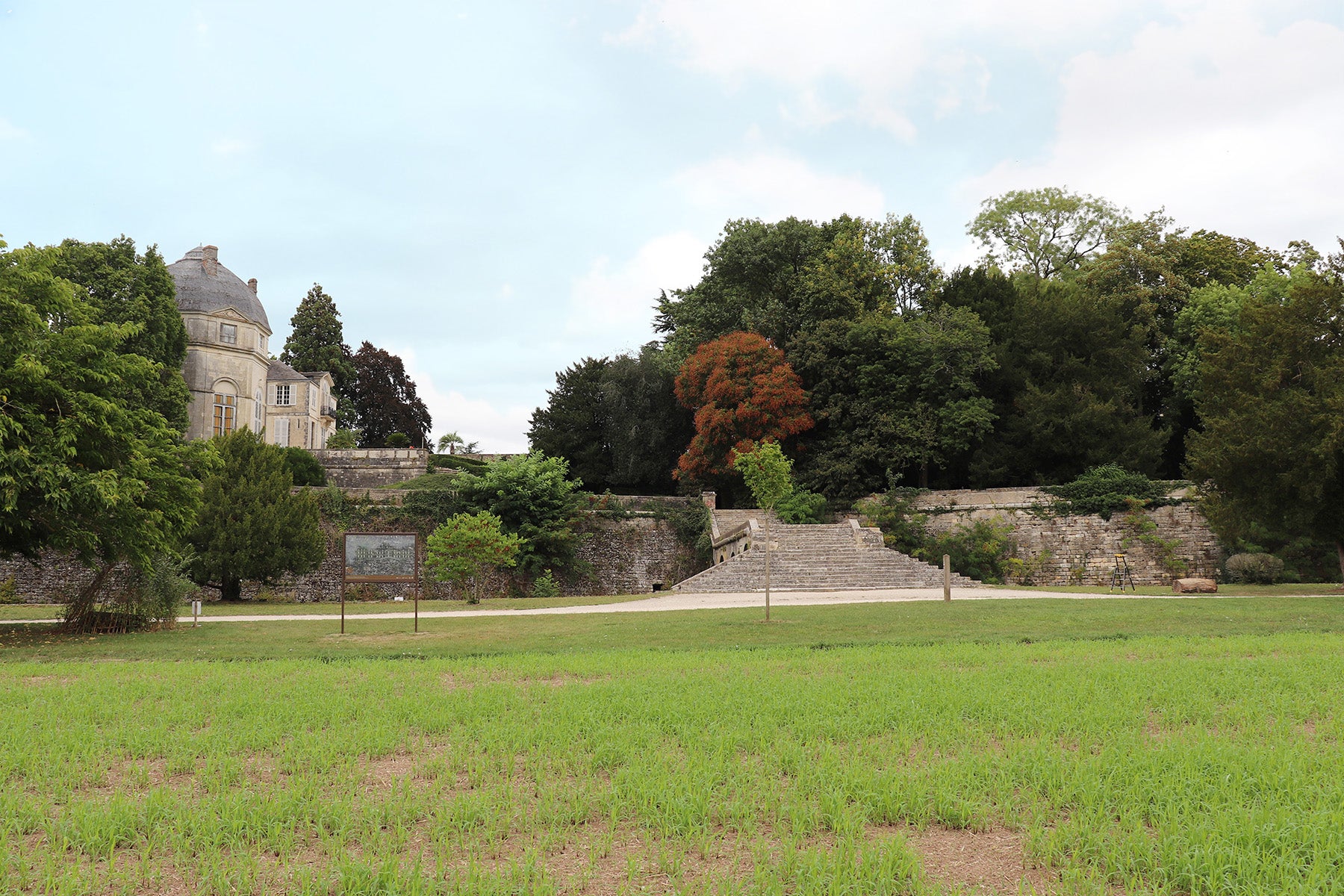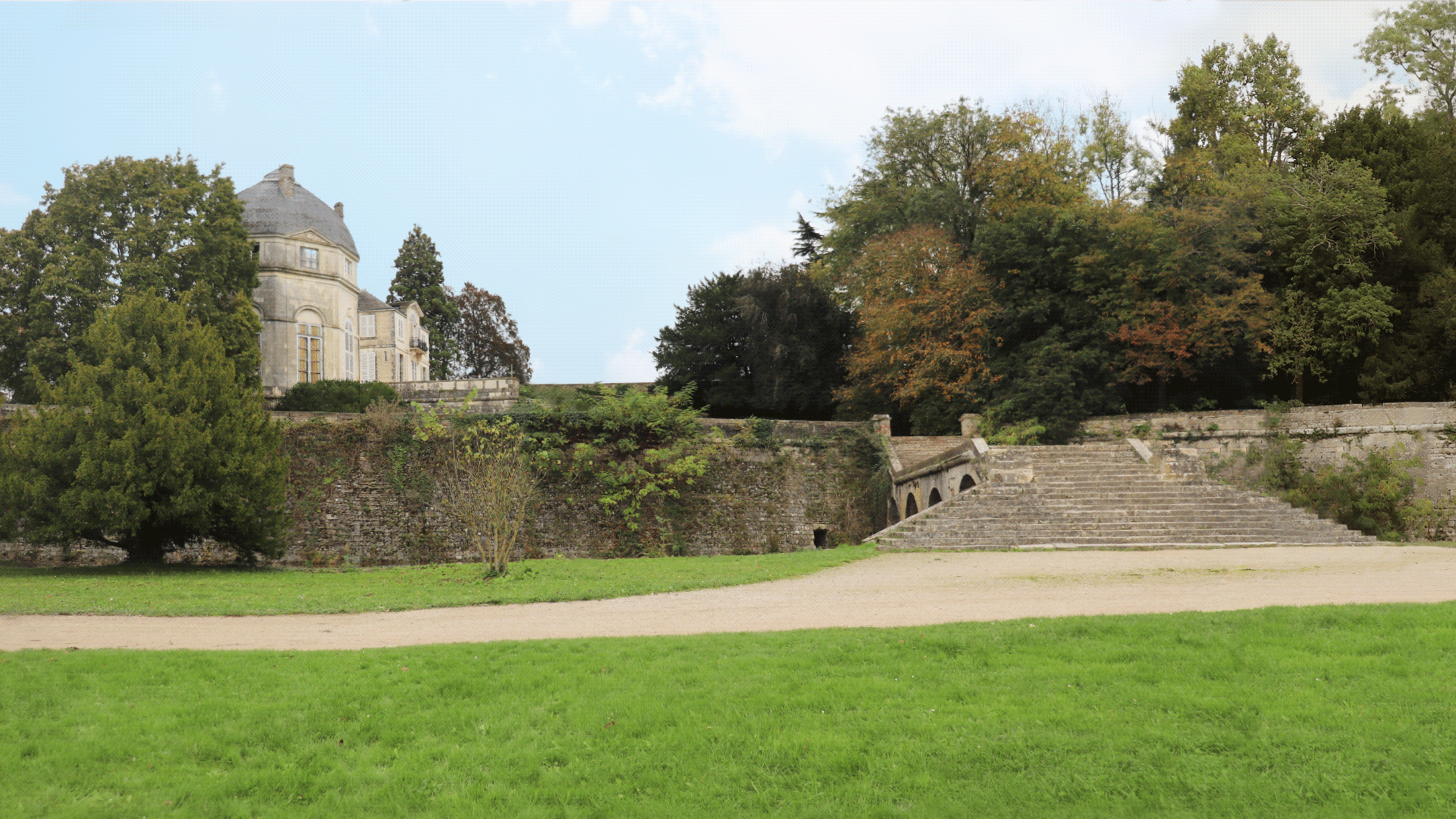 L’ensemble patrimonial a connu de nombreux événements marquants de l’histoire de France (pillage à la Révolution, plusieurs rachats, etc.) ce qui a fait évoluer la physionomie du château et de ses dépendances au fil des siècles. Afin de donner à voir aux promeneurs des indices sur l’histoire passée des lieux, les dispositifs imaginés s’offrent au public comme une fenêtre d’observation permettant de remonter le temps jusqu’au 18e siècle. En regardant à travers un cadre de verre, on découvre un dessin en filigrane qui représente des bâtiments disparus. On découvre l’état des lieux à une époque où le château occupait une emprise bien plus large avec une seconde aile appelée le grand corps de Logis.