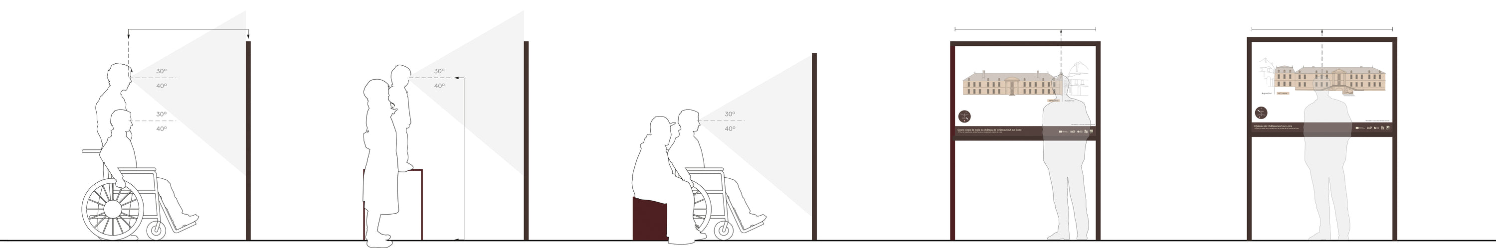L'étude de faisabilité comprends la définition de l'échelle de l'illustration, la distance entre l'usager et le dispositif, la hauteur de lecture selon les différents publics (adulte, enfant, PMR), le tout déterminé selon la perspective visible à l'oeil nu.